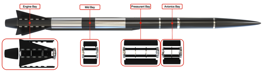 Home to the 7.5kN Ethanol-Liquid Oxygen engine, this bay features cryogenic-rated plumbing, valves, and CFRP fins. It interfaces with the ground segment for launch operations.